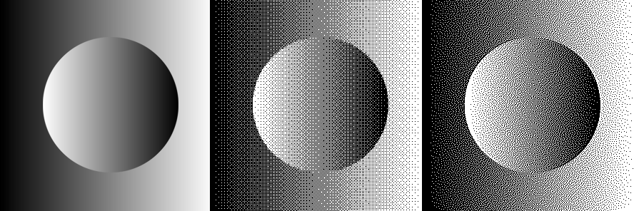 In dieser Grafik werden verschiedene Halbtonverfahren gezeigt: links das Original, in der Mitte ein Halbtonraster, rechts der Stucki-Algorithmus (ein auf dem Floyd-Steinberg-Algorithmus aufbauendes Verfahren).