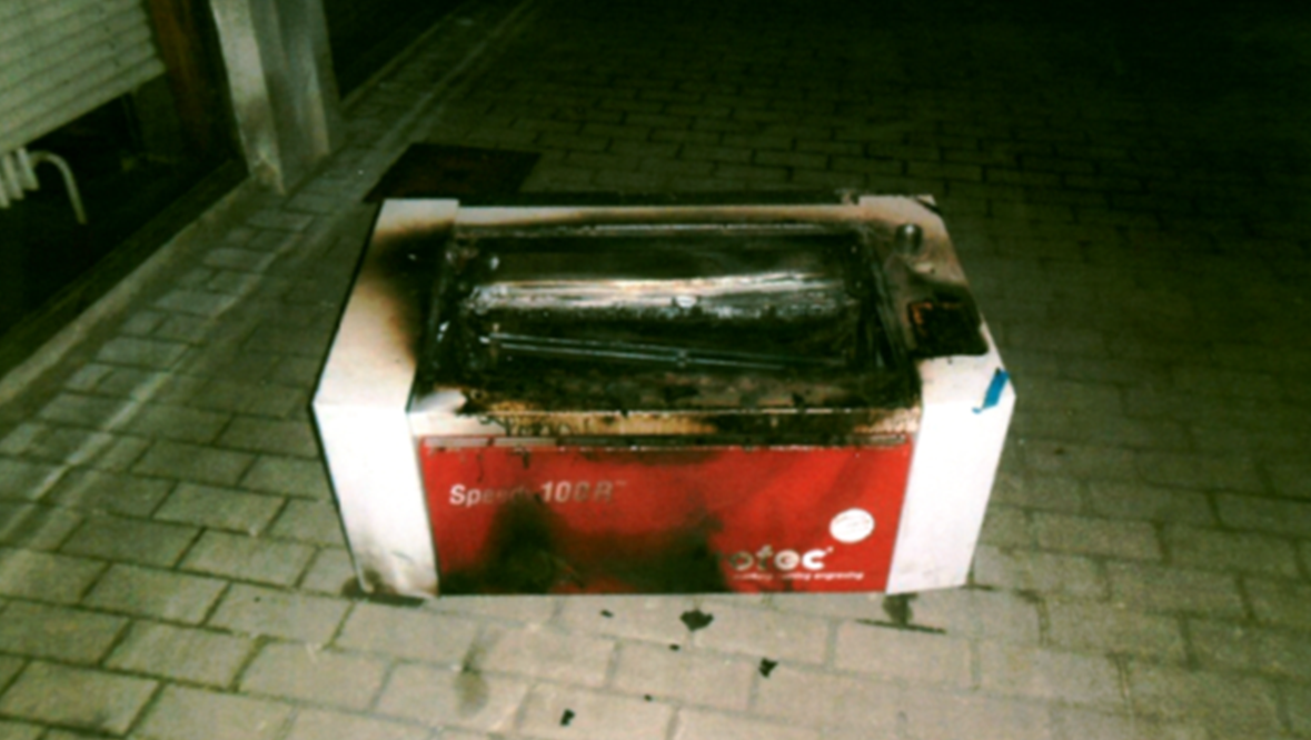 Bild: Ein ausgebrannter Lasercutter des FabLab Leuven. Der Benutzer meinte, weil die Datei dreimal funktioniert hat, müsse man beim vierten mal nicht mehr dabeibleiben.